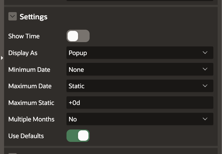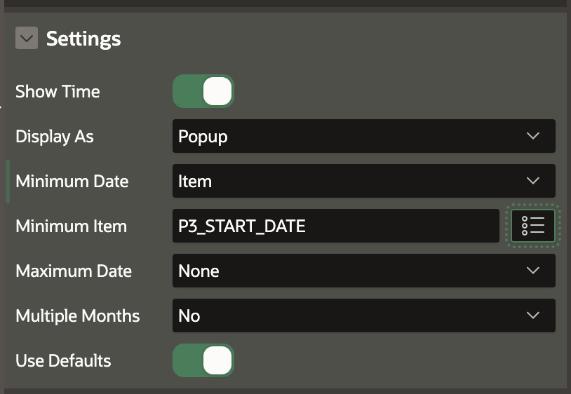 The Item option is where things get even more interesting. Say you have a start date and an end date picker on the same page. You can set the end date's Minimum Date to Item, point it to your start date item, and APEX will automatically prevent users from selecting an end date before the start date. No extra steps. Just two settings and you're done.